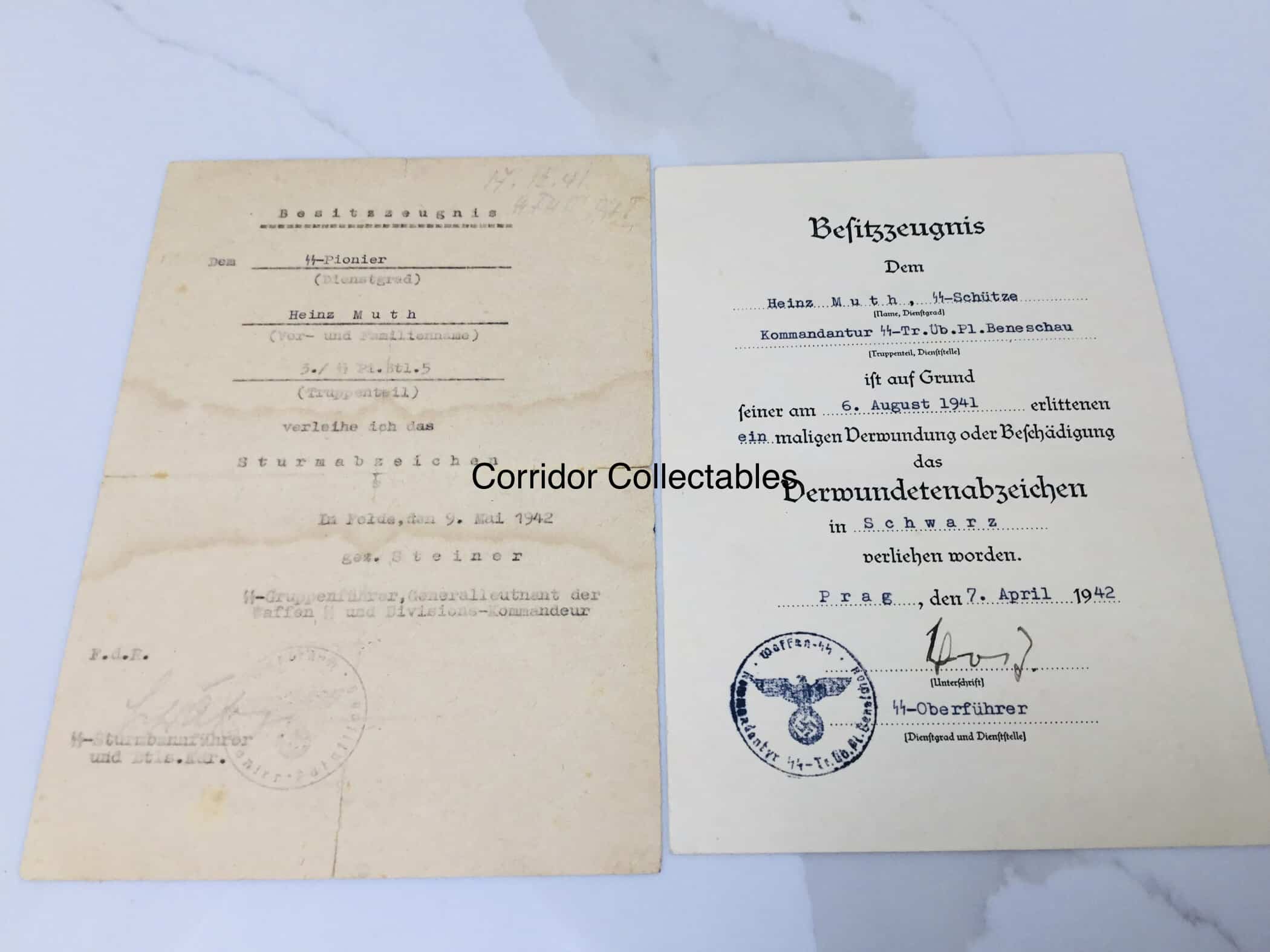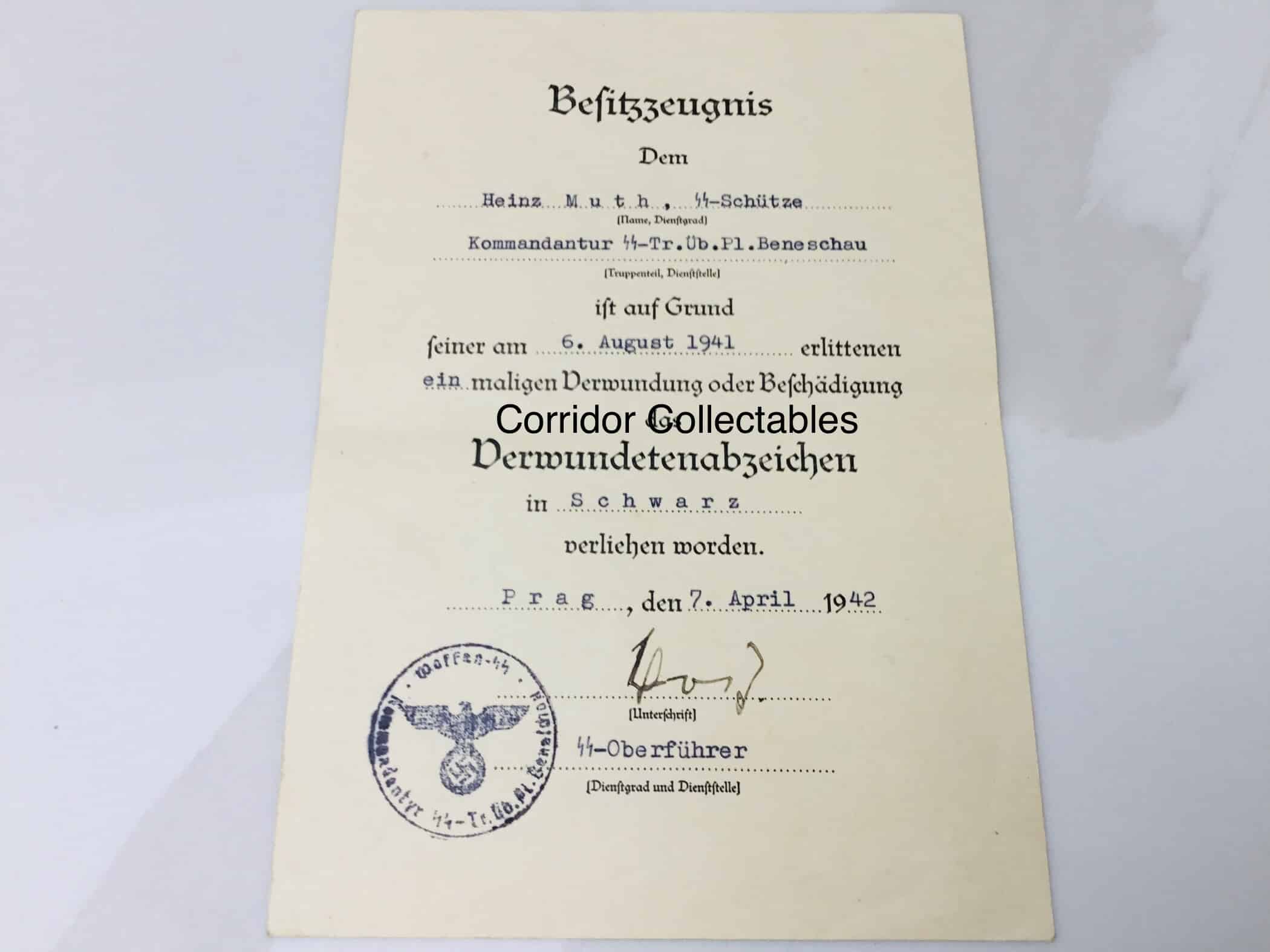 Awarded on 7 April 1942 by the Kommandatur SS-Truppen Ubungsplatz Beneschau.