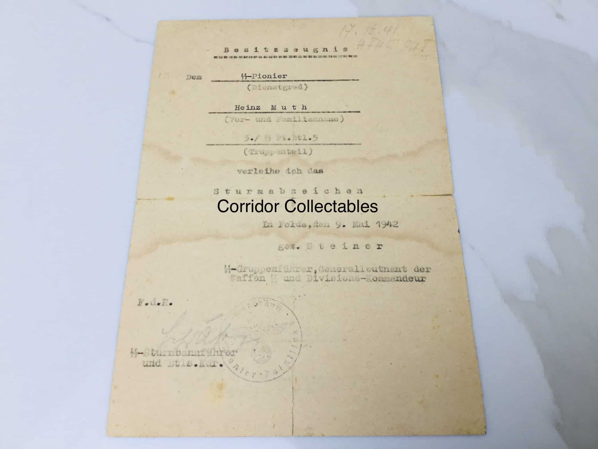 Citations Sturmabzeichen + VWA Black SS Pionier Battalion 5 Max Schafer Signature!