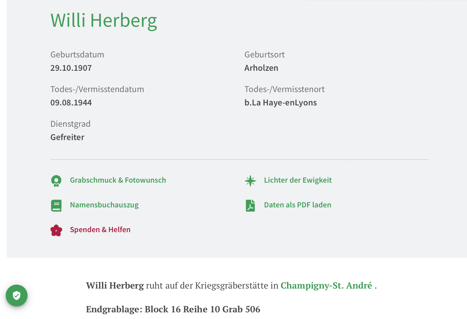 He was first burried on the Monumental cemetery in Rouen and later found his final resting place at the German war cemetary of Champigny-St. Andre.