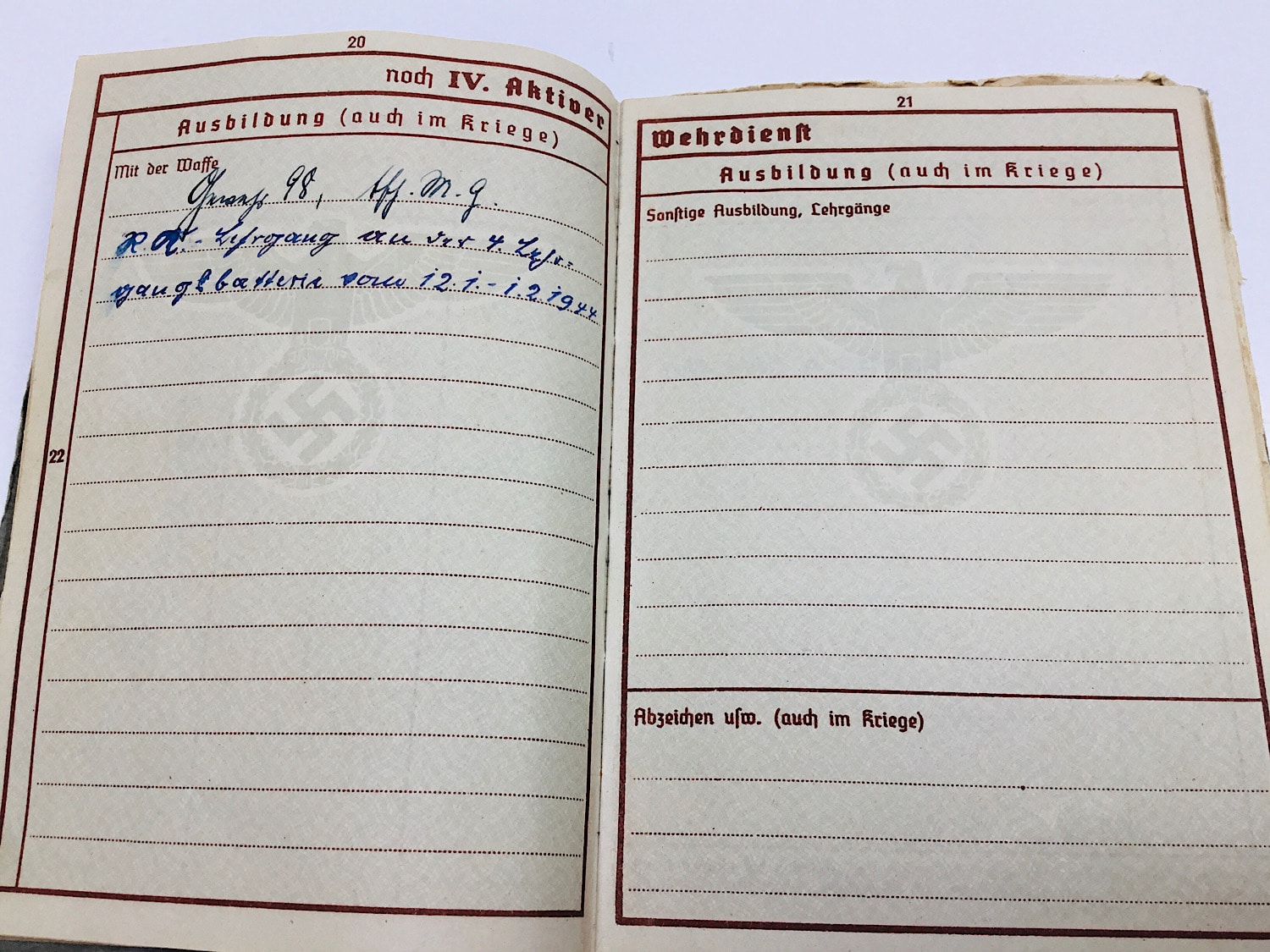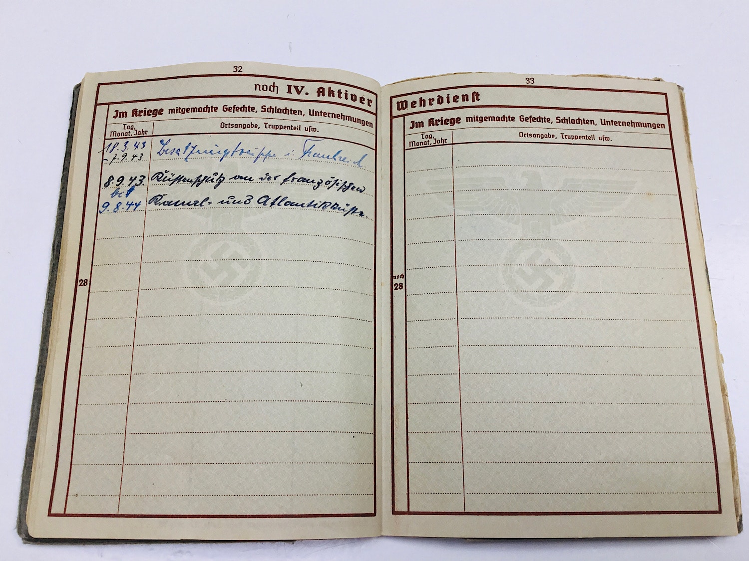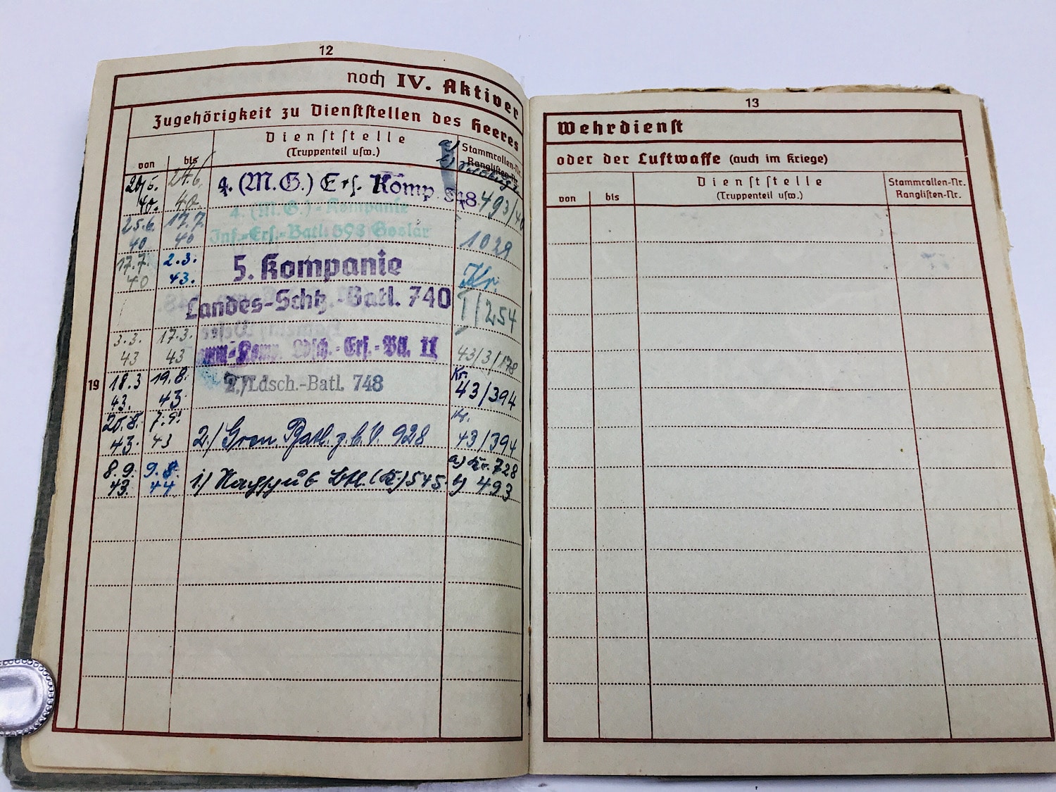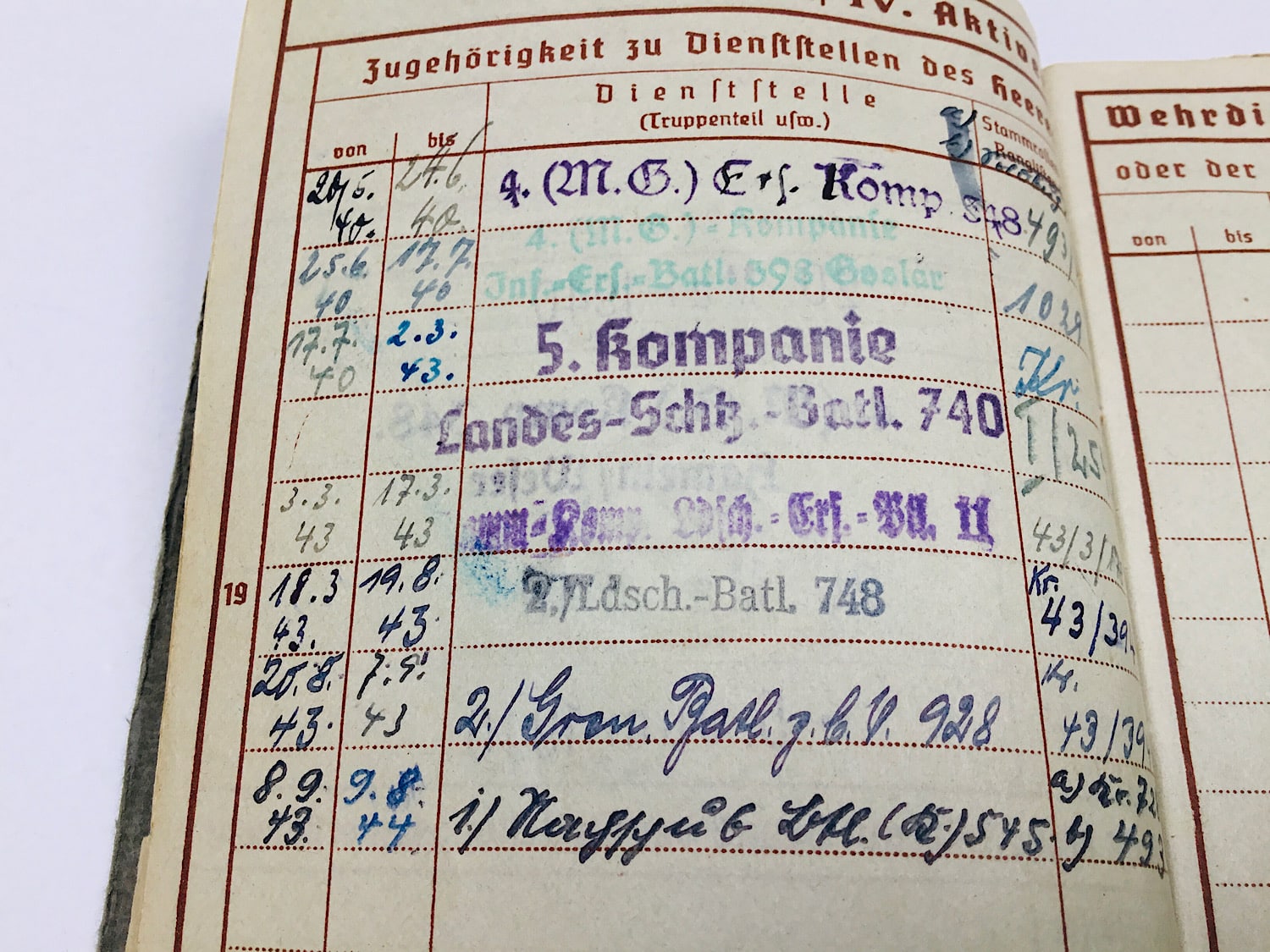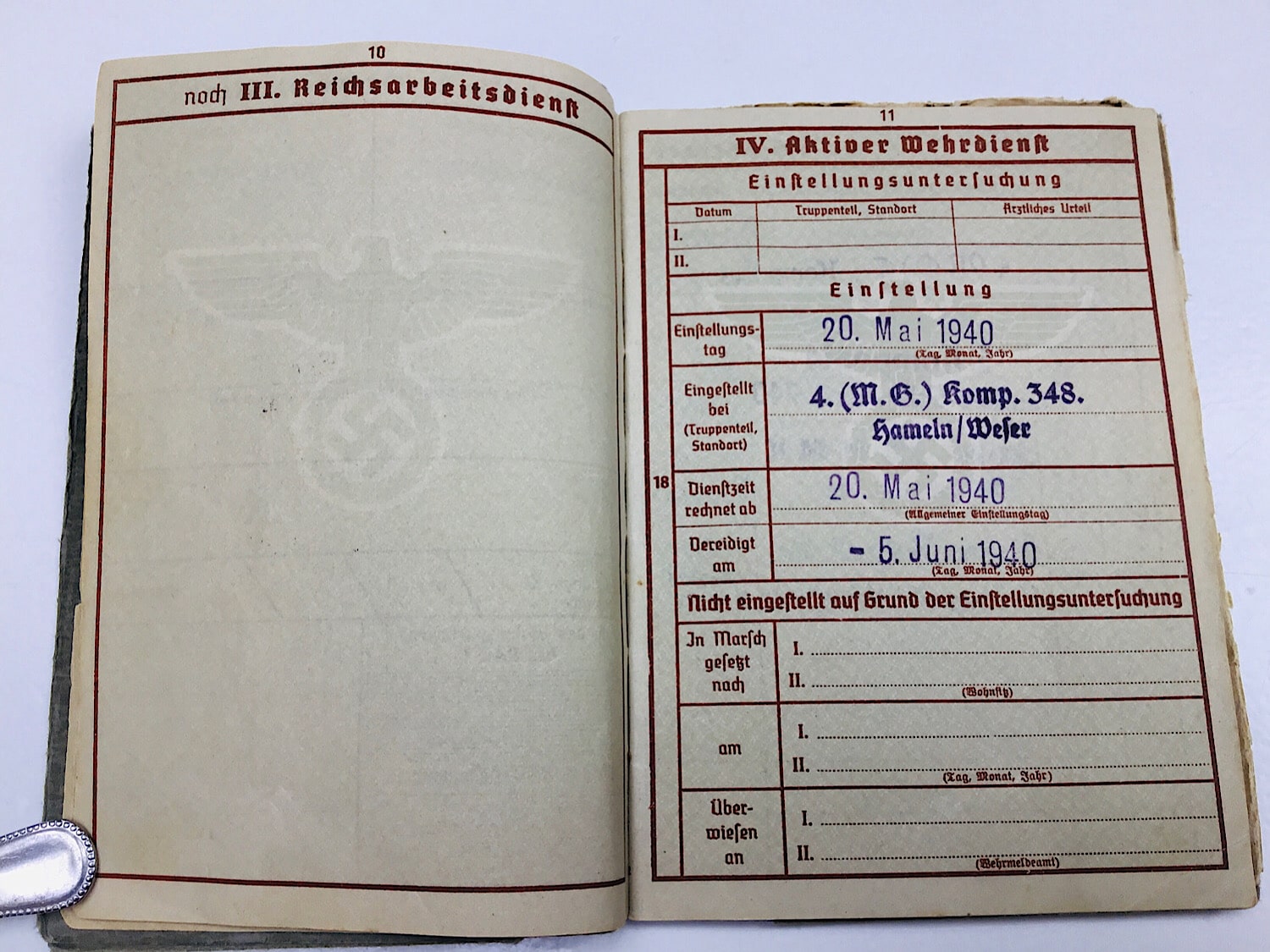 The Wehrpass opens at 20-5-1940 with 4. (M.G.) Kompanie 348 based in Hameln, Weser.