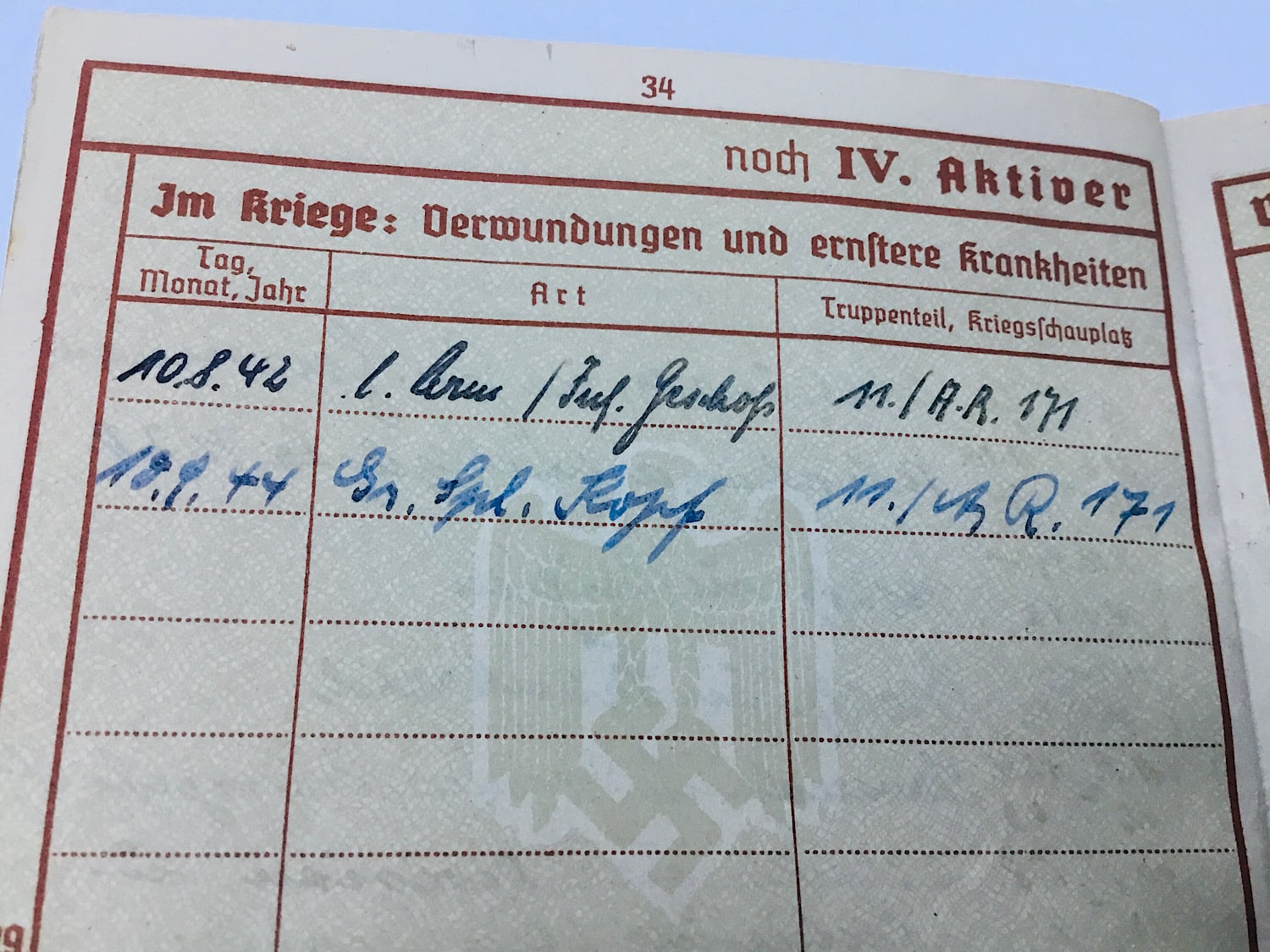 On 10 August 1942 he got wounded for the first time and was awarded the Wounded badge in Black.